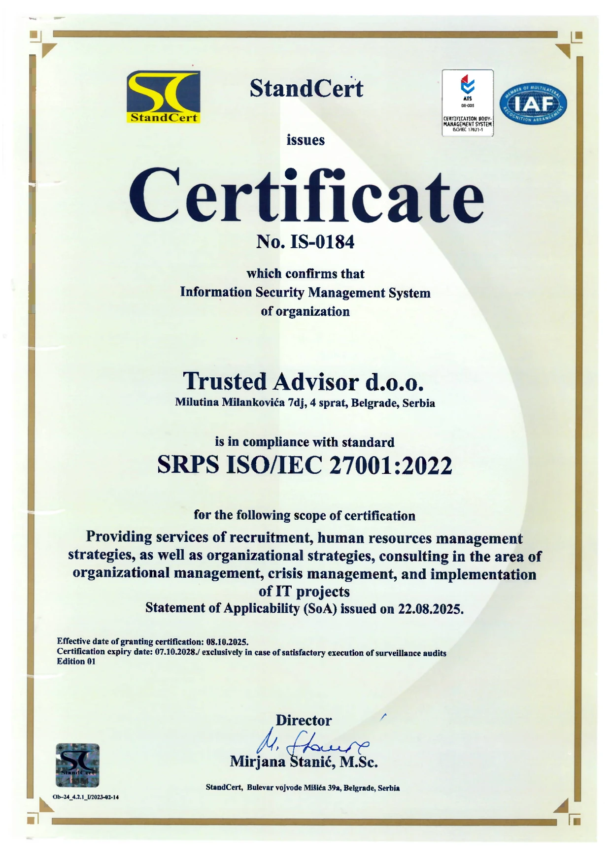 The purpose of this policy is to establish an information security management system in accordance with the requirements of the international standard ISO/IEC 27001 and determine guidelines for the protection of information and resources of the organization TRUSTED ADVISOR DOO and its information system from various threats, as well as to ensure business continuity. In this way, it reduces potential damage, improves image, increases income, and returns invested financial resources.