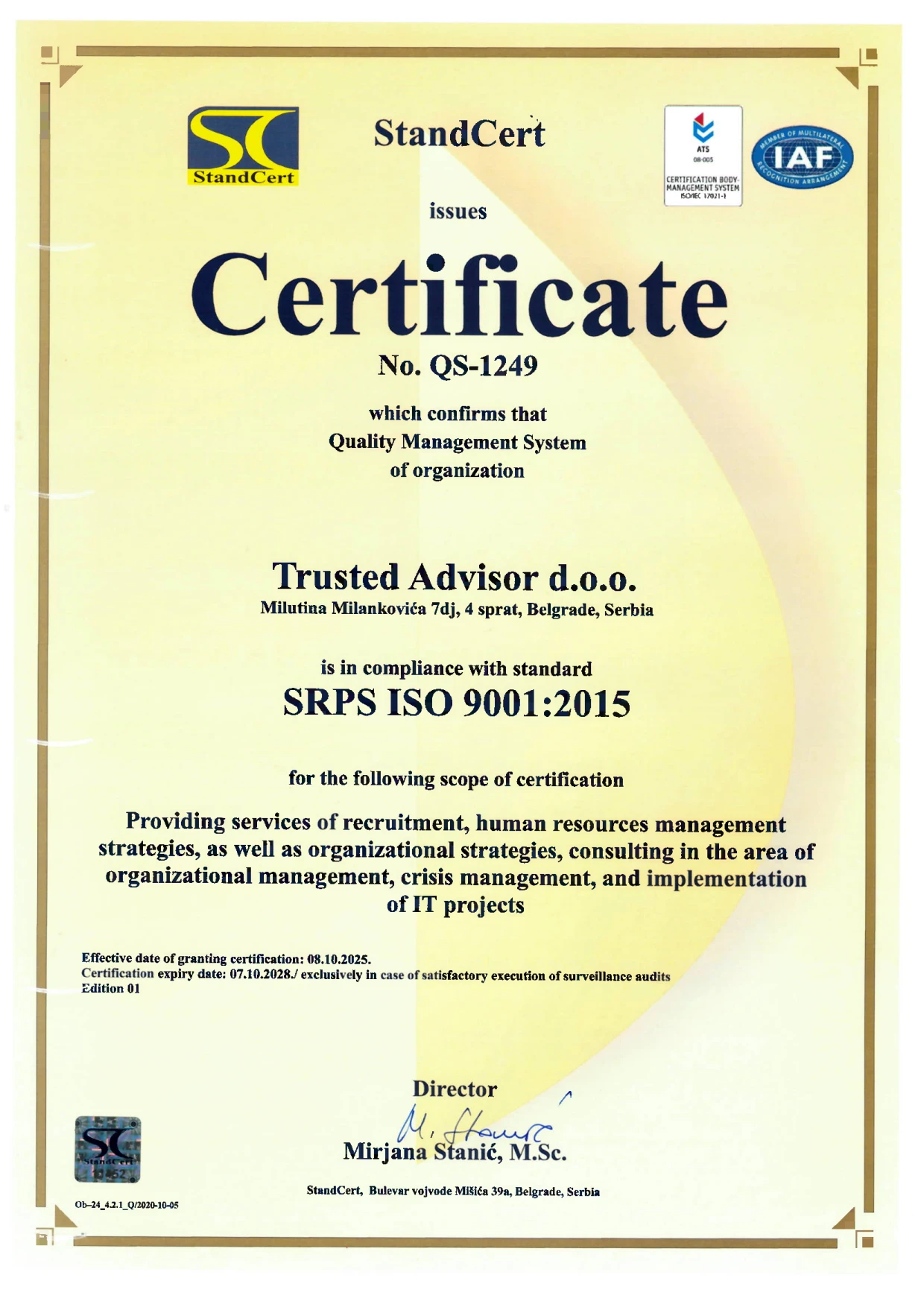 The quality policy of the organization TRUSTED ADVISOR is based on the realization of our mission and vision by providing quality services to our users with the aim of fulfilling their demands, needs and expectations.